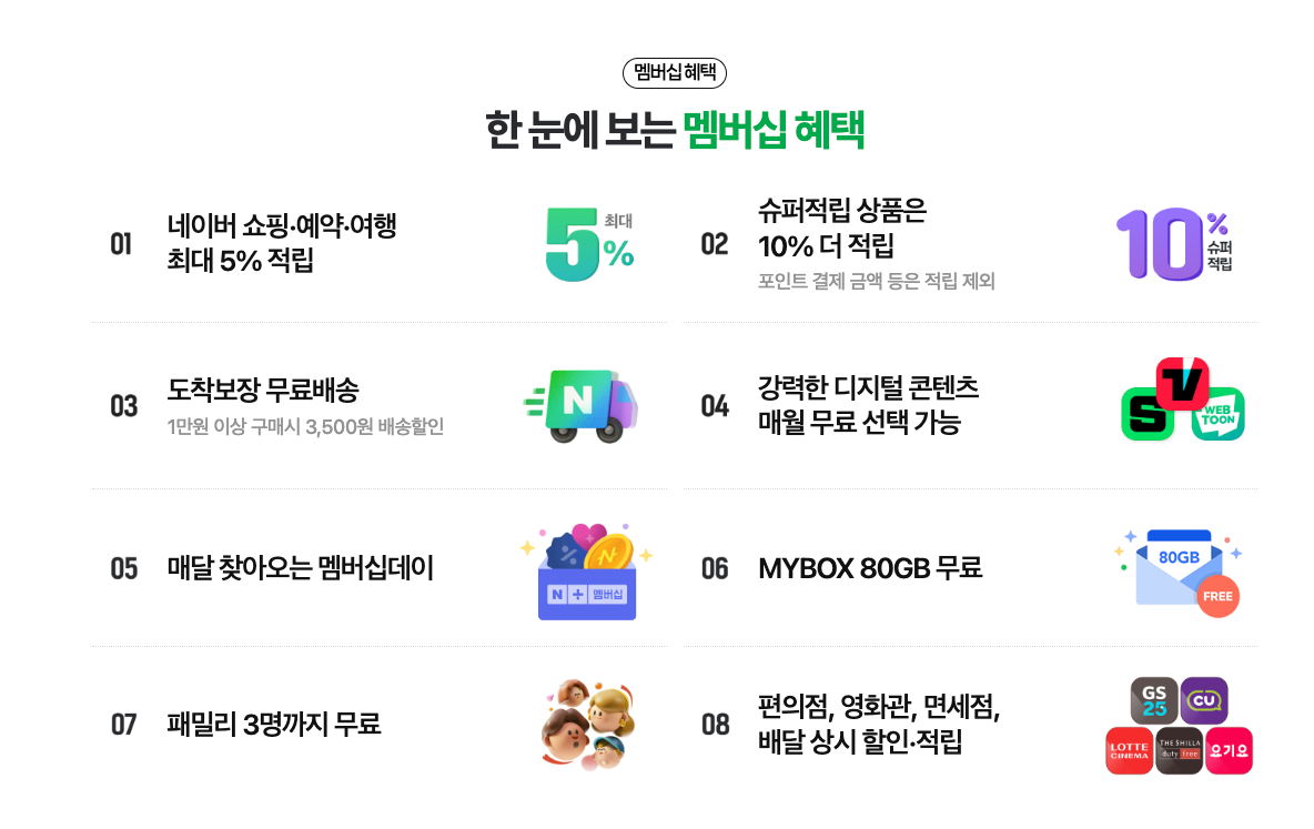 네이버플러스 멤버십은 다양한 혜택을 제공합니다. 네이버 쇼핑, 예약, 여행에서 최대 5% 적립이 가능하며, 슈퍼적립 상품의 경우 최대 10%까지 적립됩니다. 또한 1만원 이상 구매 시 무료배송을 지원하여 온라인 쇼핑을 자주 이용하는 분들에게 높은 가치를 제공합니다.MYBOX 저장공간 80GB를 무료로 제공하여 클라우드 서비스 이용자에게 유용합니다. 이 외에도 요기요 패스 X 무료배달 포장할인, 편의점•영화관•면세점 이용 시 상시 할인•적립을 지원합니다.네이버플러스 멤버십은 개인뿐만 아니라 최대 3명까지 무료로 초대할 수 있어, 가족이나 친구와 함께 혜택을 누릴 수 있습니다. 가족 단위로 쇼핑을 자주 즐긴다면 패밀리 초대 기능을 활용해 보는 것도 좋겠습니다.