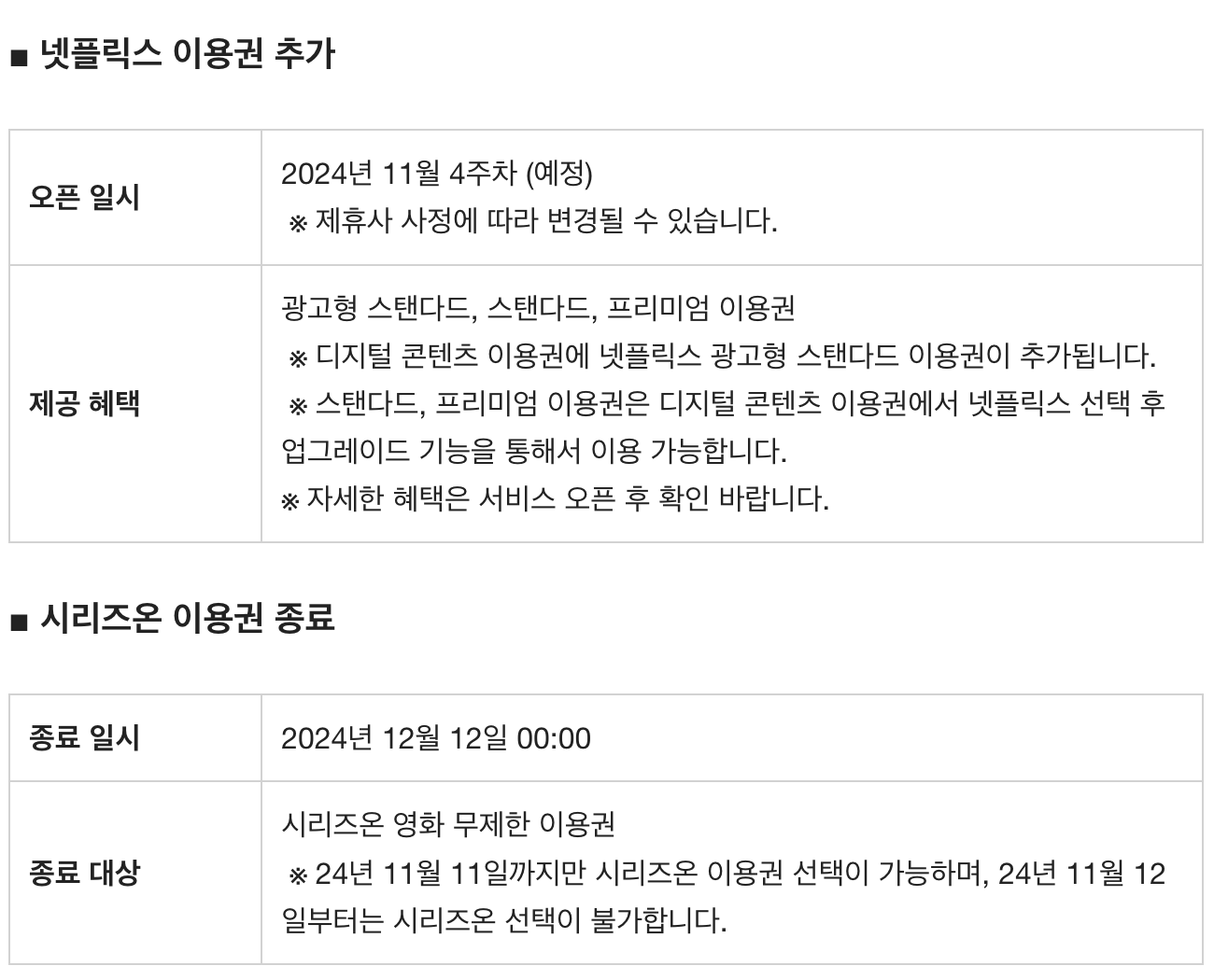 매달 하나의 콘텐츠를 선택하여 무료로 이용할 수 있는데, TVING이나 웹툰 쿠키 49개 중 하나를 선택할 수 있습니다. 기존의 시리즈온 대신 Netflix 광고형 스탠다드가 제공될 예정입니다.