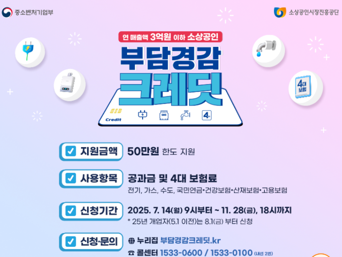 소상공인 부담경감 크레딧은 연 매출액 3억원 이하 소상공인들의 고정비용 부담을 덜어드리기 위해 공과금과 4대 보험료 일부를 지원하는 사업입니다. 간단히 말해, 소상공인 여러분의 사업 운영에 필요한 기본 비용을 국가가 일부 지원해드리는 정책이죠!