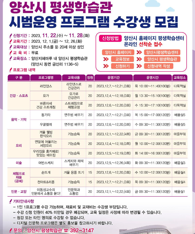 양산시 평생학습관 시범운영 프로그램 수강생 모집 안내