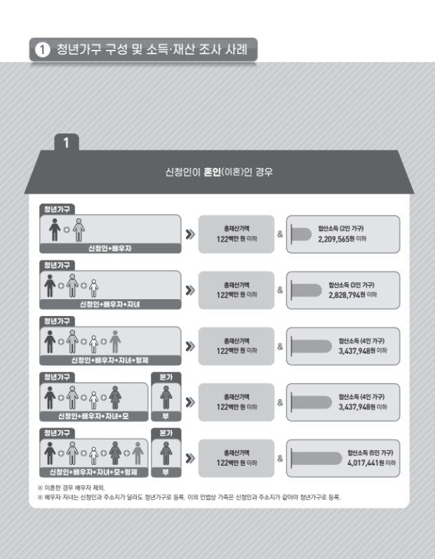 청년 가구는 청년과 배우자, 직계비속, 동일 주소에 거주하는 그 외 "민법"상의 가족을 포함합니다.
