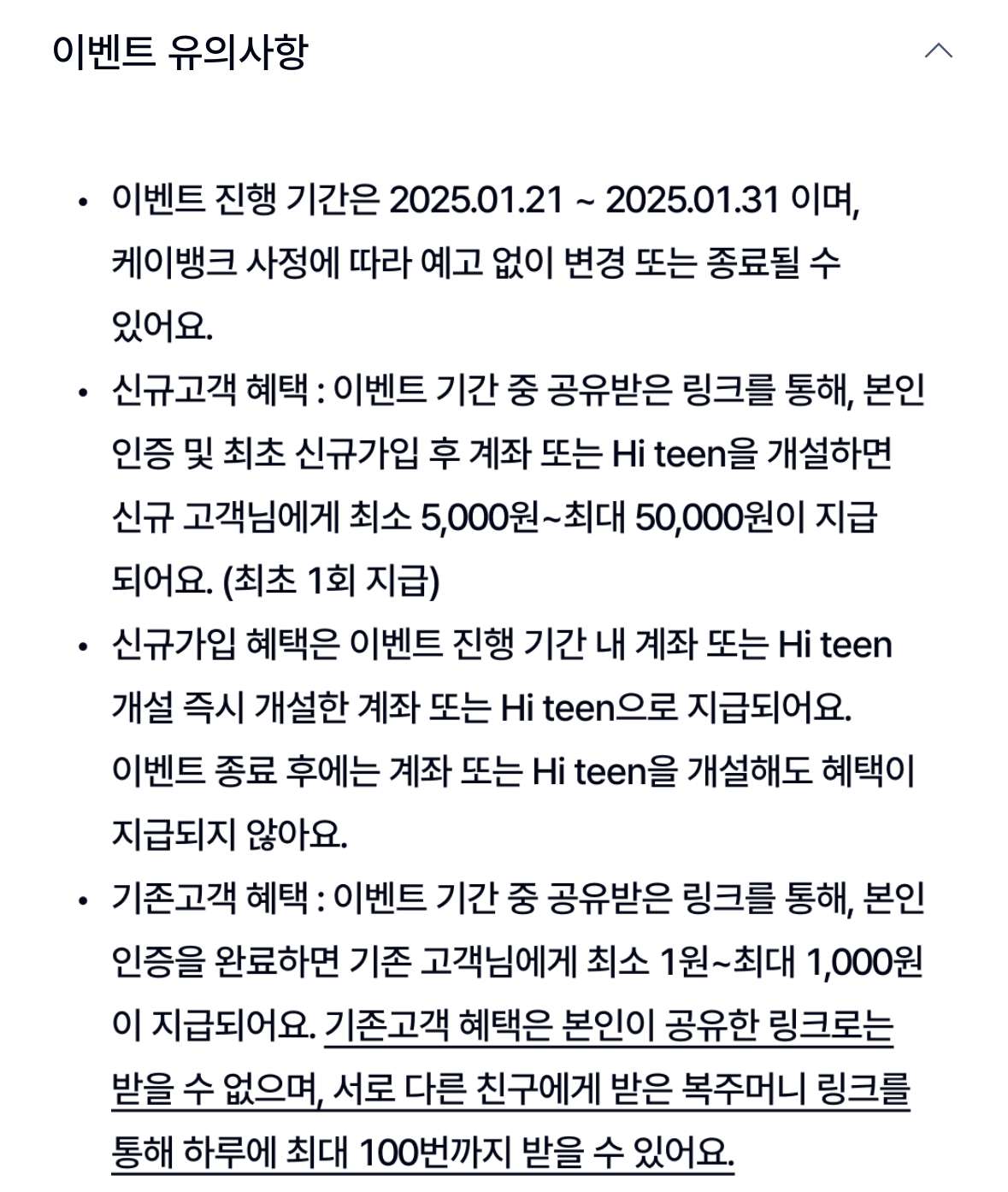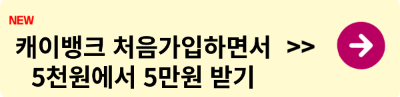 ※ 신규 고객 안내: 전용 공유 링크를 통해 케이뱅크 신규 가입 후 계좌 개설을 완료하시면 최소 5천원에서 최대 5만원까지의 혜택이 제공됩니다(최초 1회 한정).