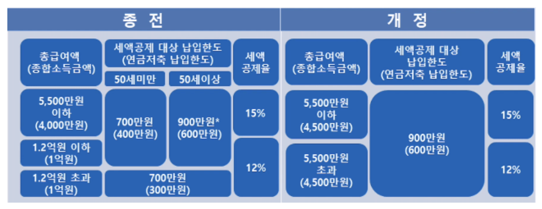 세액공제 대상 납입 한도는 연금 저축 600만 원이며, 퇴직 연금을 포함할 경우 900만 원 한도로 통일하였습니다.