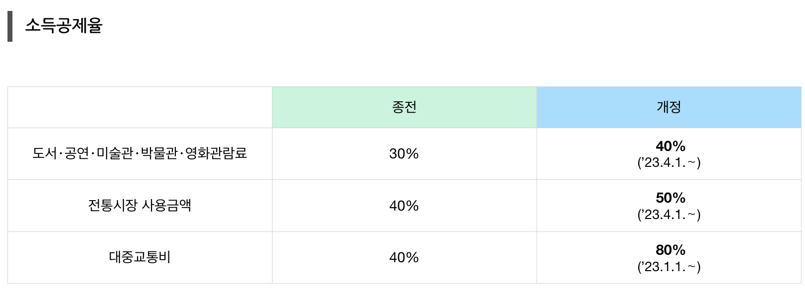 대중교통비 등 부담을 줄이기 위해 공제율이 상향조정됩니다.