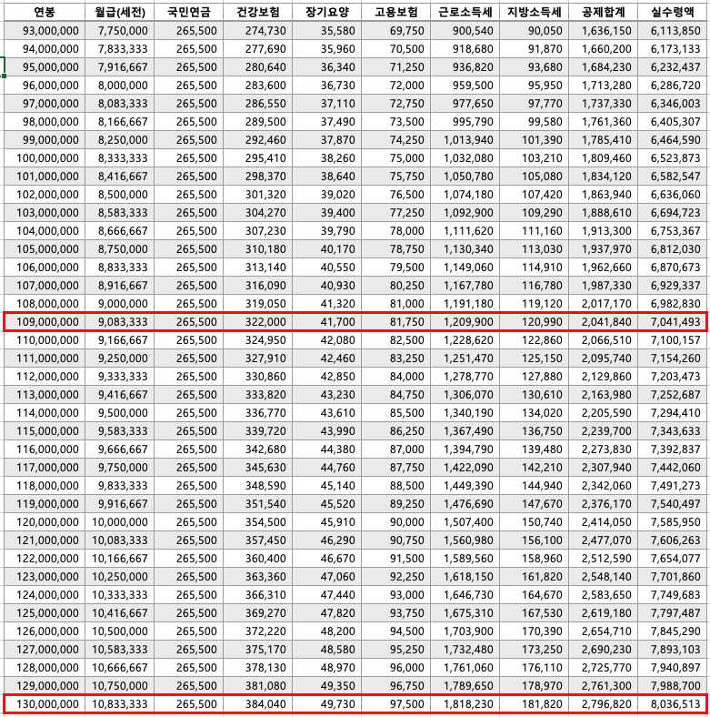 실수령액이 700만원 이상이 되려면 연봉이 1억9백만원(월급여 9,083,333원)이어야 함을 알 수 있습니다.