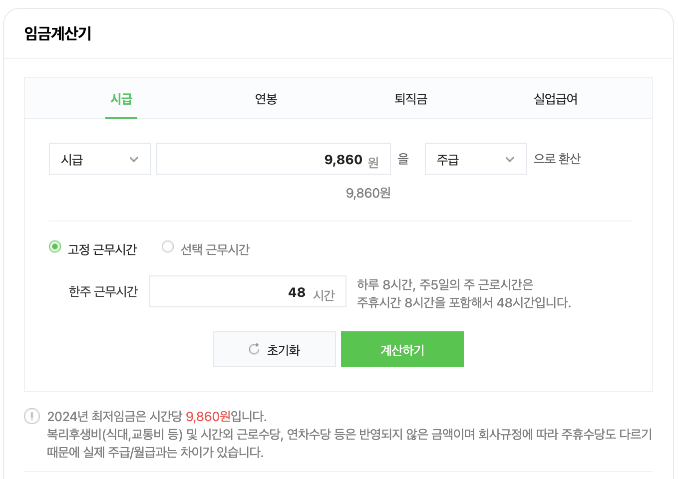 시급, 연봉, 퇴직금, 실업급여를 임의로 계산할 수 있습니다.