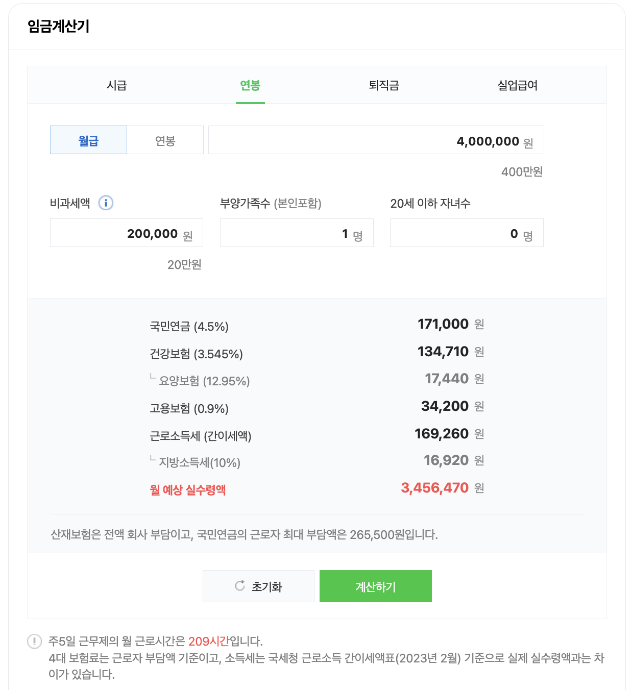 임의로 월급여 400만원 / 식대(비과세) 20만원 / 부양가족은 없고 본인만 으로 임의 계산을 해보았습니다.